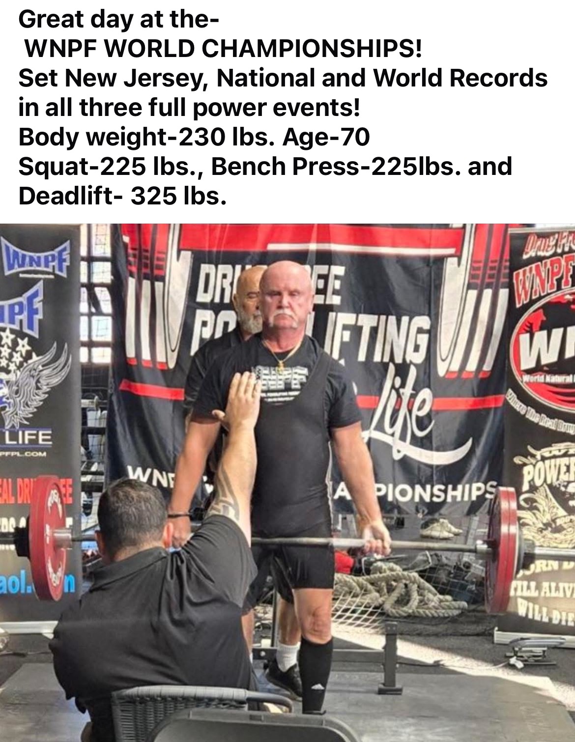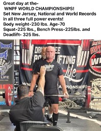 Since turning 70 I have established or broken state, national and world records in full powerlifting in the WNPF and USPL. Plus more!